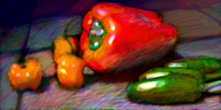 First, choose a reference photo to work from. I chose this photo of some peppers because it had some bright, bold, colors, but also some subtle muted tones. It doesn’t matter too much what photo you choose—anything will be a challenge!